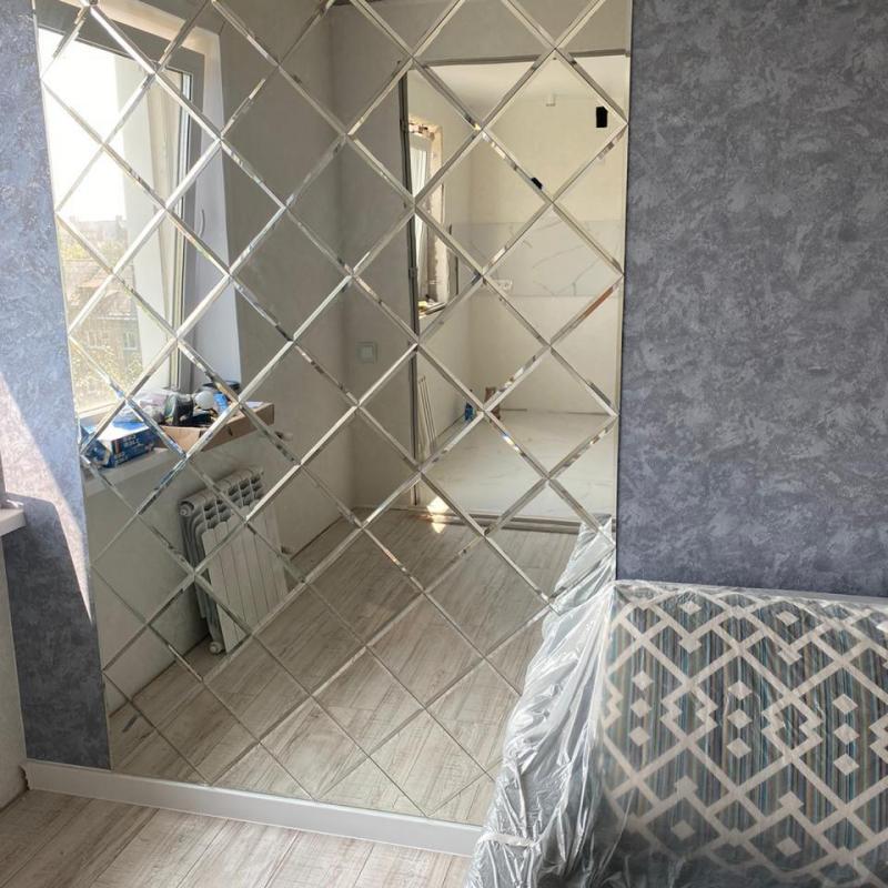• Зеркальное панно в салоне, Москва, серебряная глянцевая плитка квадратной формы